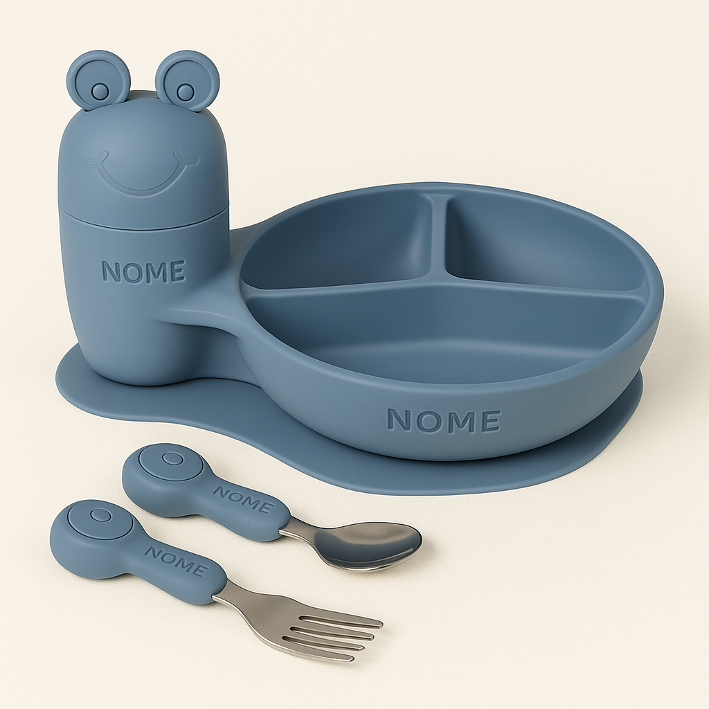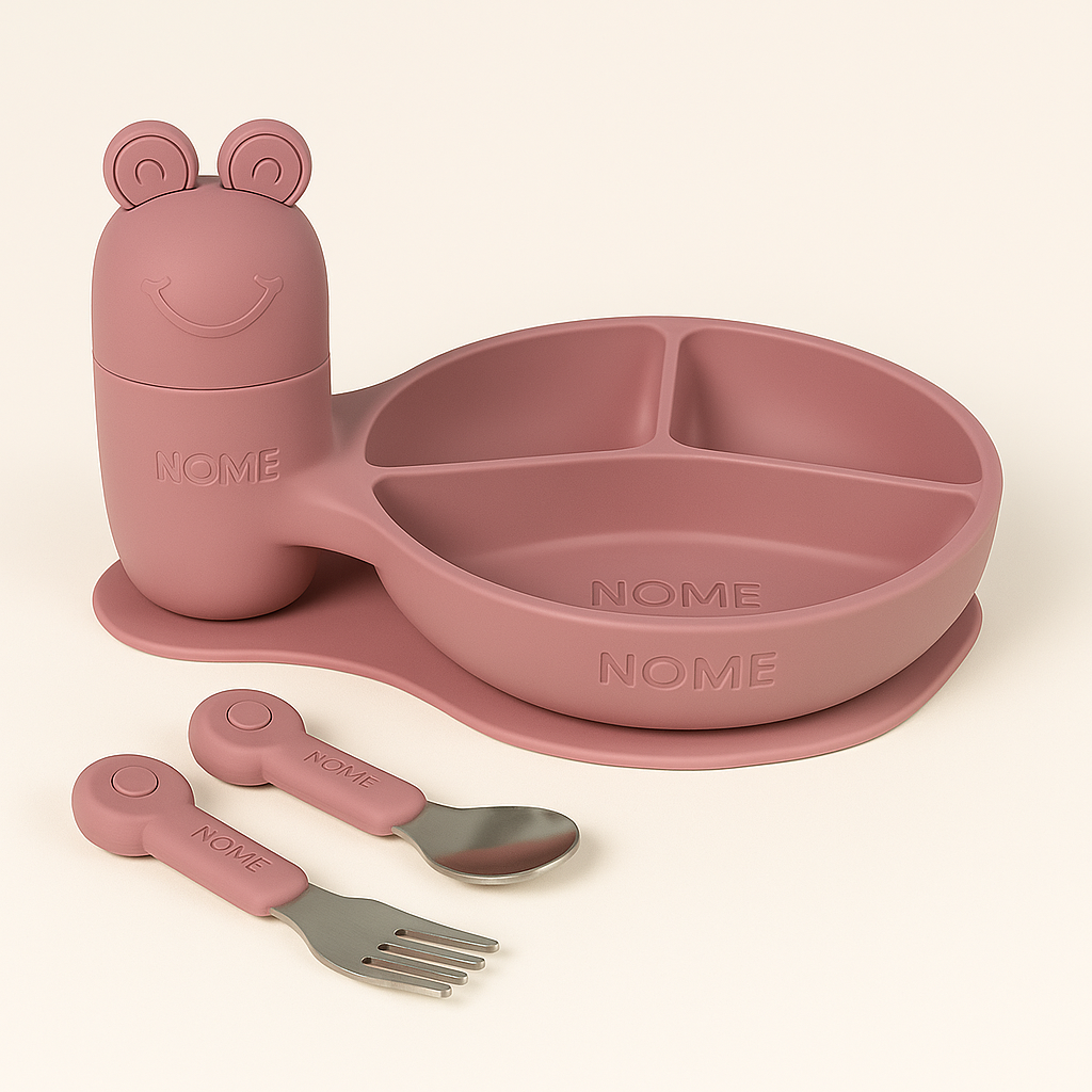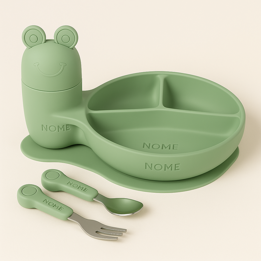Armazenamento inteligente: A “cabeça do sapinho” é uma tampa divertida que esconde um compartimento embutido no prato, perfeito para armazenar os talheres do kit. Prático e higiênico!