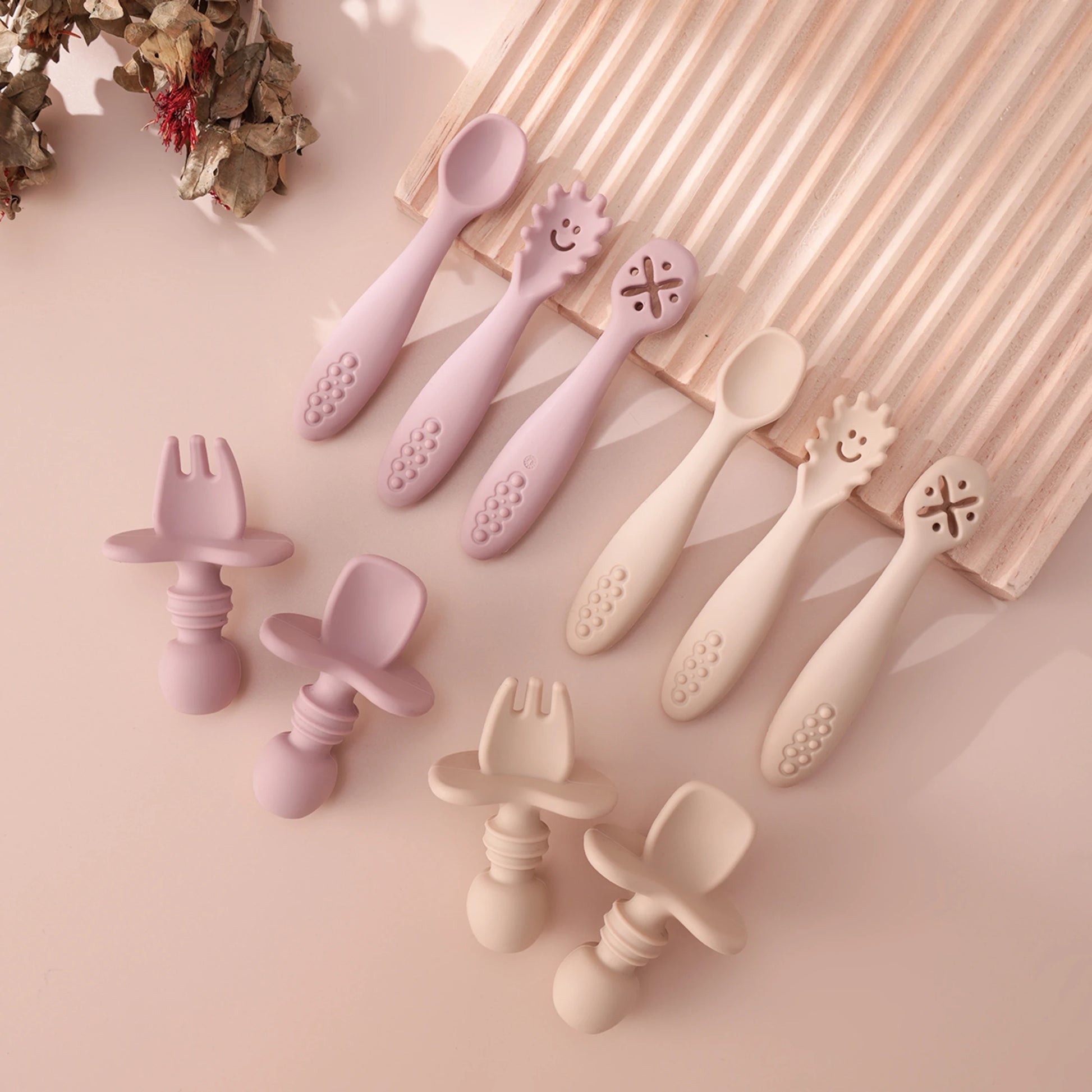 💖 Todos os utensílios são flexíveis, macios e seguros, pensados para estimular a coordenação motora e a autonomia alimentar do bebê.