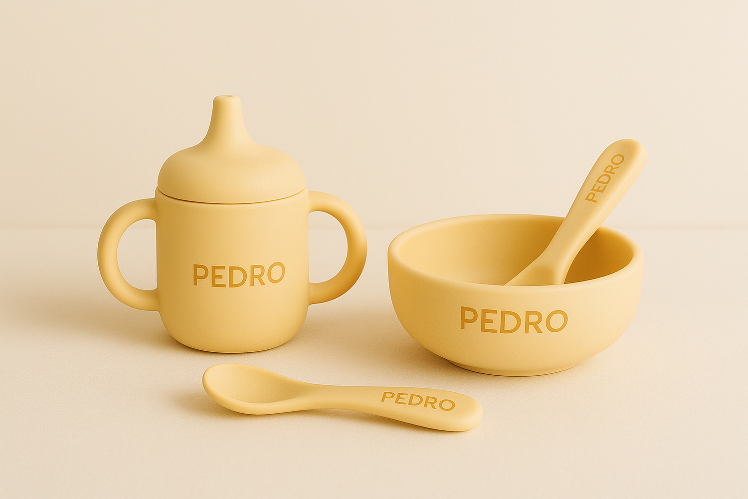 Cada peça é gravada com o nome do seu bebê, tornando cada refeição única e inesquecível.